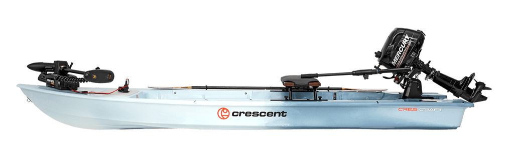 The Cres-Craft is Crescent’s high-performance motor kayak, built on a planing hull for speed and efficiency—achieving up to 19 mph with a 6 HP motor and excelling with electric power.